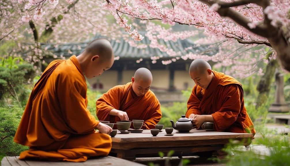 Exploring the spiritual depth of tea, you'll discover that Buddhist monasteries are dedicated to preserving ancient tea traditions with mindfulness and care. Monks treat tea preparation and serving as a form of meditation, performing each step—from selecting leaves to pouring tea—with intentionality and reverence to ensure the tradition endures.
