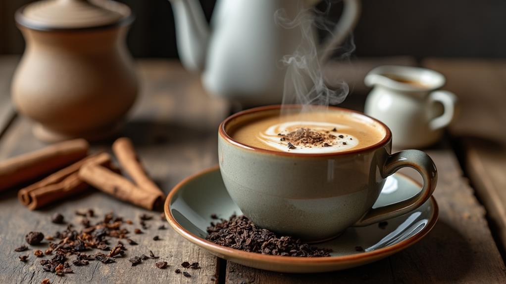 The tea latte, a delightful blend of tea and steamed milk, has roots that span several cultures and centuries. You'll find its origins intertwined with diverse traditions, each bringing its own cultural significance to this beloved beverage. In South Asia, the masala chai, a spiced tea mixed with milk, has been cherished for centuries. It's not just a drink but a symbol of hospitality and warmth, often served to guests in homes and gatherings.